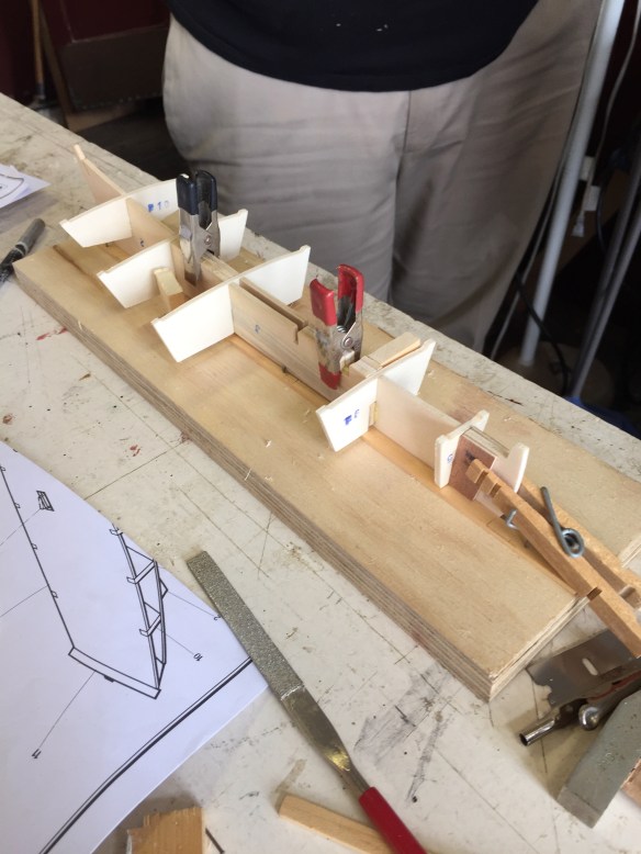 We made sure to take some photos and got as far as assembling the framework and placing the transom piece and false deck. Of course, there were a few steps required to get there. We’ll be comparing notes and will document the process in more detail, but first we need to discuss the best way to tackle these initial steps.