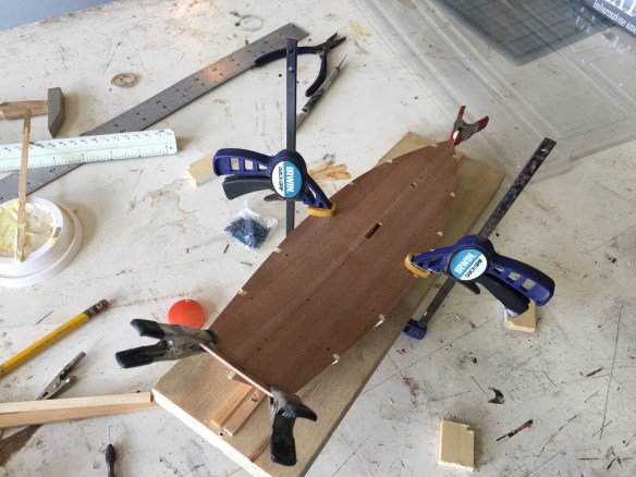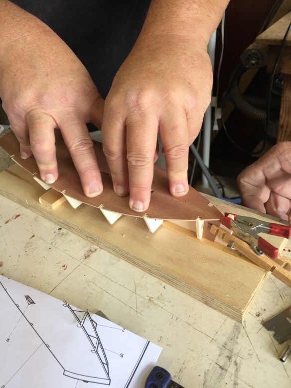 One thought was that the wood would never bend in both direction, and it certainly doesn’t want to. But, it is wood, and this condition is common in ship model kits. There was also discussion on whether or not nailing would be strong enough to hold everything together while the glue dried.