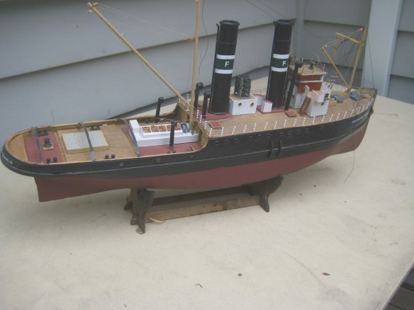 While the Hyde Street Pier Model Shipwrights group may not be meeting these days, Paul Reck shows that members are still active. His latest work is the repair of a very nice looking model of the tugboat Foundation Franklin. Below is a photo of the model that was apparently damaged by the bane of all ship models: the cleaning lady…