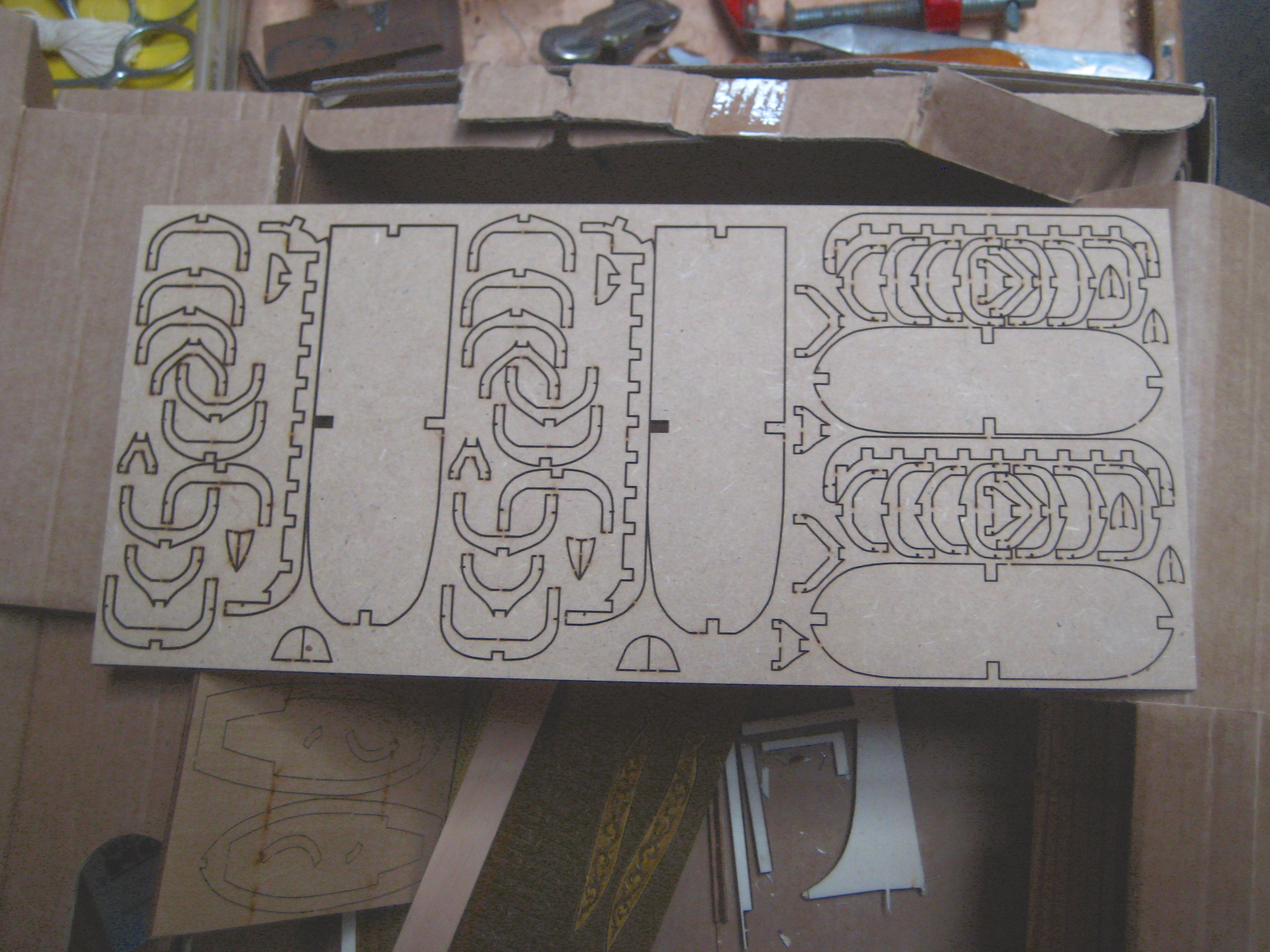 In the meantime, he submitted these photos of the model under construction, as well as the following photo of one of the laser-cut sheets, showing the parts for the ship’s four boats, which are miniature kits in themselves.